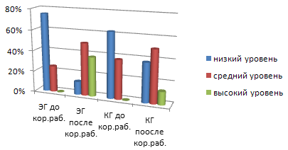 Диаграмма №17. Оценка состояния общей произвольной моторики ЭГ и КГ до и после проведения коррекционной работы. Таким образом, после проведения сравнительного анализа результатов констатирующего и формирующего экспериментов, мы можем сделать вывод о хорошей эффективности разработанной нами коррекционной программы по преодолению трудностей процесса формирования письма у детей с ОНР 2 –х классов общеобразовательной школы. Оценивая результаты обследования в ЭГ и КГ можно говорить о том, что все учащиеся с ОНР испытывают трудности в процессе обучения письму. Но более успешным оказалось преодоление трудностей при обучении письму в группе, где дети занимались, наряду с общеобразовательным обучением, по разработанной нами коррекционно-логопедической программе. Положительная динамика наблюдалась в обеих группах. Однако более выраженной она была в ЭГ. Заключение Процесс формирования грамотного письма у детей в настоящее время является одной из самых распространенных проблем, которой необходимо уделять достаточное внимание педагогам, родителям, психологам и логопедам. Тенденция роста детей с нарушениями речи в последнее время говорит о росте актуальности данной проблемы. В условиях современного общества мало внимания уделяется вопросам коррекционной работы с детьми, а , как показывает практика, существует большая необходимость в проведении такой работы. Поэтому для нас было интересно изучение проблемы формирования процесса письма и разработка методик работы с учащимися .по данной теме. В процессе констатирующего эксперимента нами было проведено обследование письма и произвольной моторики у учащихся 2-х классов общеобразовательной школы № 5. Обследование проводилось в три этапа: На первом этапе проводился отбор учащихся 2-х классов СОШ №5 станицы Стародеревянковской Каневского района, имеющих множественные ошибки в тетрадях по родному языку. Из 16 детей отобранных на данном этапе были сформированы две группы по 8 человек (КГ и ЭГ). На втором этапе было проведено обследование произвольной моторики и состояния письма в обеих группах. Третий этап проходил на протяжении всего времени, потраченного на обследование и обучение детей. Его целью было уточнение индивидуальных проявлений нарушений письменной и устной речи у детей, и внесения корректировок в план работы. Результаты проведенных обследований переводились в проценты для сравнения полученных данных до и после проведения формирующего эксперимента. Результат сравнения полученных данных до и после коррекционного обучения показал, что на процесс формирования письма влияет состояние всей речевой системы. А так же состояние общей и мелкой моторики. Для устранения трудностей процесса формирования письма была разработана коррекционно-логопедическая программа. Она была направлена на формирование: - полноценных фонематических процессов; - представлений о звуко-буквенном составе слова; - навыков анализа и синтеза звуко-слогового состава слова; - коррекцию дефектов произношения; - формированию лексико-грамматической стороны речи; - формированию связного высказывания; - формированию представлений о морфологической стороне речи; - улучшение общей и мелкой моторики. В результате проведенной коррекционно-логопедической работы снизилось количество трудностей при