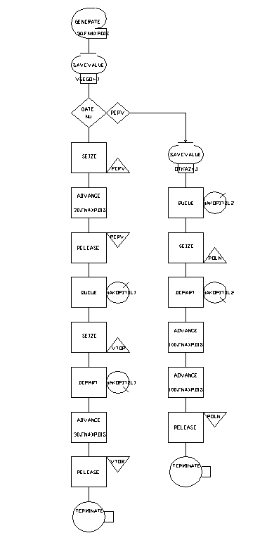 Рисунок 1.1 - Формалізована схема роботи регулювальної ділянки цеху 1.2 Розгляд моделюючої системи з позицій теорії масового обслуговування У розглянутої одно канальна СМО один однорідний, стаціонарний і ординарний вхідний потік подій - надходження пари агрегатів. Перед пристроями повного і вторинного регулювання можуть формуватися необмежені по довжині черги. Дисципліна обслуговування: "перший прийшов - перший обслугований". Таким чином, ми маємо багатофазну одно канальну СМО з однорідним, стаціонарним і ординарним вхідним потокам без обмежень на довжину черги, з абсолютно надійними (тобто не потребуючого ремонту) приладами. Формулювання основного і додаткового критеріїв оптимальності функціонування СМО. Основні показники ефективності: - завантаження нагромаджувача; - імовірність відмовлення. Додаткові показники ефективності: - коефіцієнти використання пристроїв регулювання. 2. СИСТЕМА ІМІТАЦІЙНОГО МОДЕЛЮВАННЯ GPSS/ PC 2.1 Основні положення мови GPSS / PC Мова розроблена в 1961 році фірмою ІBM слідом за розробкою компілятора з мови ФОРТРАН. Являє собою Фортран - орієнтовану версію мови ЇМ. Перші реалізації GPSS будувалися у виді процесора, тобто вихідним текстом програм, що аналізують пропозиції GPSS, були тексти на Фортрані. Існує багато версій GPSS, що є найбільш розповсюдженою мовою даного класу. В даний час розроблені повні версії GPSS для ПЭВМ. GPSS призначений для моделювання систем з матеріальними й інформаційними потоками. Можна описувати систему і керувати маршрутами проходження через об'єкти систем спеціальних динамічних елементів - транзактів (транзакт, транзакція - повідомлення). Транзакт може сприйматися як динамічна одиниця матеріального чи інформаційного потоку, здатна переміщатися від об'єкта до об'єкта й імітувати послідовність обслуговування, що одержує транзакт за час перебування його в системі. Всі оператори GPSS умовно поділяються на класи: - динамічні (зв'язані з транзактами); - апаратно - орієнтовані - їм у досліджуваній системі відповідає пристрій, зайняте обслуговуванням, тобто виконанням роботи тієї чи іншої властивості (зв'язані з активностями); - статистичні - реалізують збір і обробку статистичноїінформації; - операційні - призначені для керування потоками транзактів; - різні (не зв'язані визначеною функцією). Вихідна програма мовою GPSS/PC, як і програма на будь-якій мові програмування, являє собою послідовність операторів. Оператори GPSS/PC записуються і вводяться в ПК у наступному форматі: - номер рядка ім'я операція операнди ; - коментарі Об'єкти GPSS/PC можна розділити на сімох класів: - динамічні; - операційні; - апаратні; - статистичні; - обчислювальні; - запам'ятовуючі; - що групують. Динамічні об'єкти, що відповідають заявкам у системах масового обслуговування, називаються в GPSS/PC транзактами. Вони "створюються" і "знищуються" так, як це необхідно по логіці моделі в процесі моделювання. З кожним транзактом може бути зв'язане довільне число параметрів, що несуть у собі необхідну інформацію про цьому транзакті. Крім того, транзакти можуть мати різні пріоритети. Операційні об'єкти GPSS/PC, називані блоками, відповідають операторам-блокам вихідної програми. Вони, як уже говорилося, формують логіку моделі, даючи транзактам указівки: куди йти і що робити далі. Модель системи на GPSS/PC можна представити сукупністю блоків, об'єднаних від