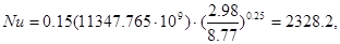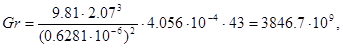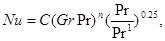 где Критерий Pr и Pr1 определяют при температуре греющей среды и тепловоспринимающей поверхности. При T=60˚С, Pr=2,98; при Т=17˚С, Pr=8,77 [10,стр.262] где g – ускорение свободного падения, м/с2 ; ν – коэффициент кинематической вязкости, м2 /с, ν=0,6281∙10-6 м2 /с; β – коэффициент объемного расширения, К-1 , β=4,056 К-1 ; [10, с.269] ∆t – разность температур воды и стенки, К, ∆t=43˚С;