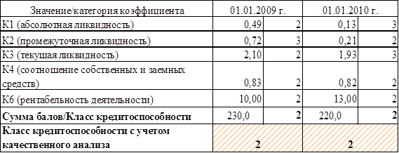 Присутствие ВТБ 24 на розничном рынке росло еще более стремительно. В отличие от большинства конкурентов ВТБ 24 по итогам года смог увеличить портфель кредитов населению (в 2 раза). Кредиты, предоставленные финансовым органам субъектов Российской Федерации и органов местного самоуправления выросли на 173506 тыс. руб. и составили 5 574 281 тыс. руб., кредиты, предоставленные финансовым организациям, находящимся в федеральной собственности – на 269 917 тыс. руб. и составили 274 917 тыс. руб., кредиты, предоставленные коммерческим организациям, находящимся в федеральной собственности – на 6 234 868 тыс. руб. и составили 12 771 710 тыс. руб. Кредиты, предоставленные некоммерческим организациям, находящимся в федеральной собственности сократились на 3000 тыс. руб., кредиты, предоставленные финансовым организациям, находящимся в государственной (кроме федеральной) собственности – на 18 542 тыс. руб., кредиты, предоставленные негосударственным финансовым организациям – на 5 944 856 тыс. руб. Кредиты, предоставленные негосударственным коммерческим организациям увеличились на 50 172 979 тыс. руб. и составили на 01.01.2010 г. 203 810 604 тыс. руб., кредиты, предоставленные негосударственным некоммерческим организациям – на 851 009 тыс. руб., кредиты, предоставленные физическим лицам - индивидуальным предпринимателям – на 1 299 798 тыс. руб. Кредиты, предоставленные юридическим лицам-нерезидентам уменьшились на 1 299 798 тыс. руб. и составили 1 299 798 тыс. руб. и составили на 01.01.2010 г. 20449101 тыс. руб. Кредиты, предоставленные физическим лицам-нерезидентам выросли на 2642 тыс. руб. 2.3 Оценка методов определения кредитоспособности заемщика Рассмотрим оценку методов определения кредитоспособности заемщика на материалах ЗАО – фирма «Чебоксарская керамика» на основе расчета финансовых коэффициентов и определим класс и рейтинг заемщика [17, c. 61]. Таблица 4. Оценка основных показателей деятельности предприятия ЗАО – фирма «Чебоксарская керамика» за 2008 - 2009 гг.