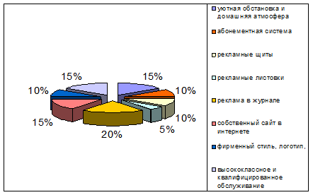 3. Главные методы в активизации продажи услуг: - рекламные щиты; - распространение рекламных листовок в начале деятельности; - реклама в женских журналах и местном телеканале; -создание собственного сайта с подробным описанием выполняемых услуг, прейскурантом цен. Для успешного функционирования салона красоты потребуется: 1. фирменный стиль, логотип и т.д. (это первый показатель качества услуг организации). 2. высококлассное и квалифицированное обслуживание. 3. уютная обстановка и приятная атмосфера. 4. абонементная система, дающая право на скидки своим постоянным покупателям. К потенциальным клиентам салона данного красоты относятся люди с достатком чуть выше среднего. Так же в салоне предполагается продажа фитонапитков. Что в значительной степени повысит привлекательность салона (рис. 1, 2). Составляющие 100% успеха!