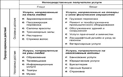 Рисунок 5. Классификация услуг по Томасу В соответствии с данной классификацией рассматриваемая нами услуга определяется как: · базирующаяся на использовании техники · выполняемая с помощью квалифицированных операторов Действительно, поддержка сайтов требует участия квалифицированных специалистов, разбирающихся в данном вопросе, и использующих последние достижения компьютерной техники и технологии. 3.4 Классификация по Лавлоку Лавлок в 1983 году осуществляет сводный обзор подходов к классификации услуг в маркетинге, а также матричный принцип для разработки новых схем анализа. Так, в основу первой и наиболее важной матрицы Лавлоком положены два фундаментальных признака классификации услуг: • состав объектов (на кого или на что направлены действия, являющиеся сутью услуги); • характер этих действий — являются ли они осязаемыми или неосязаемыми. В четырех квадрантах созданной автором матрицы отражены услуги, представляющие из себя: 1. Совершение осязаемых действий, направленных на людей. В ходе данных процессов предоставления услуги необходимо физическое присутствие заказчика для того, чтобы он мог получить желаемые блага. 2. Совершение осязаемых действий, направленных на физическое имущество заказчика. В этих случаях должен присутствовать физический объект заказчика, но не сам заказчик. 3. Неосязаемые действия, направленные на сознание человека, такие, как радио и телевидение, образование. В этом случае заказчики должны присутствовать ментально, но могут находиться либо в специальном помещении, где предоставляется услуга, либо в определенном месте, связь с которым осуществляется посредством передаваемых сигналов или с помощью телекоммуникаций. 4. Неосязаемые, действия, направленные на неосязаемые активы (страхование, обработка информации, инвестиции, банковское дело и др.). Для предоставления этих услуг прямая вовлеченность заказчика может быть ненужной (по крайней мере, в теории) — достаточно, чтобы был инициирован заказ на услугу. Данная матрица представлена на Рисунке 6.