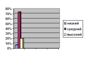 Анализ таблицы 1 показал, что уровень личностной тревожности среди испытуемых распределился следующим образом: - низкий – 1 человек (7%); - умеренный – 7 человек (73%); - высокий – 2 человека (20%).