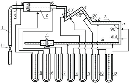 Рис.1.1 Схема установки 1 - первый участок трубы, d= 24,5 мм; 2 - второй участок (расширение), d= 38,4 мм; а - внезапное расширение; б, в, г, д, е - повороты; ж - прямой участок 3 - третий участок, d= 18 мм; 4 - диафрагма, d= 9 мм; 5, 6, 7, 8, 9, 10, 12 - диф. манометры; 11 - вентиль Таблица 1.1 Протокол наблюдений