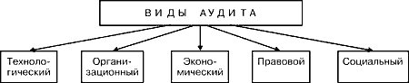 Рисунок 1.3.2. Виды аудита Технологический аудит - это контроль на базе норм и стандартов профессионального уровня и текущего состояния техники и технологии, используемой аппаратом управления организации. С его помощью выявляется соответствие или несоответствие уровня техники и технологии, а также их количества в зависимости от трудоемкости, сложности и совместимости выполняемых функций работниками аппарата управления организации. Особенно эффективно технологический аудит используется при аудите управленческих информационных технологий. Организационный аудит - это контроль на базе норм и стандартов процессов создания, функционирования, реорганизации и ликвидации организации. Он включает сбор и оценку информации об организационной сфере деятельности системы управления. Например, аудит соответствия управленческой технологии организационной структуре управления организации; аудит распределения и выполнения сотрудниками функций управления. Важной стороной организационного аудита является контроль соответствия норм и стандартов современному развитию управленческой науки и практики. Экономический аудит - это контроль соблюдения экономических норм, правил расчетов и отчетности. Аудит бухгалтерского учета является составной и наиболее разработанной его частью. Его объектами являются: экономическая стратегия фирмы, бизнес-план, учетная политика, экономическая эффективность системы управления, элементы материального стимулирования персонала. В качестве стандартов для проведения экономического аудита используются типовые утвержденные методики расчетов и оценок. Социальный аудит - это контроль соблюдения социальных норм, правил и расчетов, связанных с деятельностью коллективов в организации. Его объектами являются: коллективные договора между администрацией и коллективом организации, психофизиологические условия работы персонала, эргономика, экология, методы формирования социальных групп, методы оценки персонала, коммуникации в коллективе и организации в целом, методы обучения персонала. В качестве стандартов для проведения социального аудита используются утвержденные в организации методики и договора, а также законодательные акты РФ по социальным вопросам. Правовой аудит - это контроль соблюдения выполнения международных, государственных и местных законодательных актов и положений, а также внутренних для организации уставных документов и распоряжений руководителя. Объектами правового аудита являются договора, контракты, акты, положения, соглашения о намерениях, сведения о персонале и контрагентах, условия сделок, уставные и регистрационные документы фирмы, учетная политика фирмы, архивы фирмы. В качестве стандартов используются утвержденные в организации документы, а также законодательные акты РФ. [5] Так, аудит информационного обеспечения процесса управления складывается из следующих конкретных видов контроля: · технологический аудит. Контроль наличия информационной техники и технологии, числящейся на балансе организации, и проверка ее состояния, заявленной в управленческом учете, совместимость между собой; · экономический аудит. Контроль эффективности использования информационной техники и технологии, эффективности полученной и произведенной информации; · организационный ауд