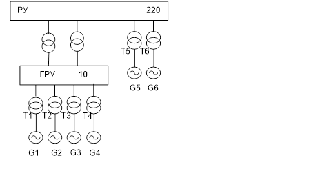 Рис. 2.1 Во втором варианте к РУ220кВ присоединено два генератора по 110 МВт и один мощностью 235 МВт, к ГРУ10 присоединяем четыре генератора по 78 МВт. Связь между ГРУ 10 Кв и РУ220 кВ осуществляется так же двумя автотрансформаторами связи.
