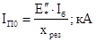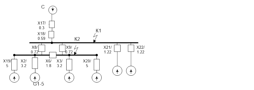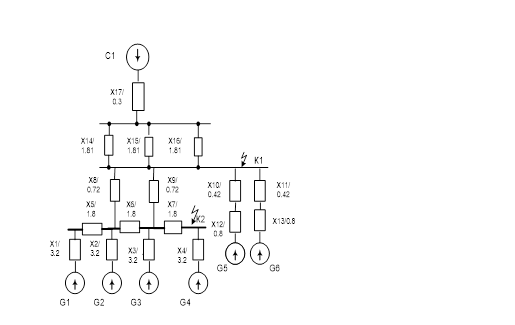 Т.к. процент экономичности равен 16,34%, то расчет веду по первому варианту, так как он экономичнее. 5. ВЫБОР СЕКЦИОННЫХ РЕАКТОРОВ, НАПРЯЖЕНИЕ 10 Кв Реакторы выбираем по номинальному напряжению, току и индуктивному сопротивлению. Намечаем к установке реактор РБДГ на номинальное напряжение 10 кВ с номинальным током 4 кА. Выбираем по напряжению: U ном. р. = 10 кВ , U уст. = 10 кВ Выбираем по току: I ном. ≥ 0.7 I ном. Iном ≥ 0.7 * 6880 = 4816 А= 4,816Ка. Выбираю реактор типа РБДГ-10-400-0,18 6. РАСЧЁТ ТОКОВ КОРОТКОГО ЗАМЫКАНИЯ Расчёт токов короткого замыкания производим для выбора оборудования и токоведущих частей и проверки их на термическую и динамическую стойкость. Параметры отдельных элементов: С: Sкз = 100 МВ∙А; Xc * =0.03; W: l123 =240км; G1 -G4 :ТВФ-63-2 – Sном Г = 78 МВА; xd `` = 0,203 G5-6 : ТВВ-200-2 – Sном Г = 253 МВА; xd `` = 0,191 Т5 -Т6 :ТРДЦН-160000/220 - Sном Т = 160 МВ∙А; Uk % = 11.5% Т7 :ТДЦ-125000/220 - Sном Т = 125 МВА; Uk % = 10.5% Т8 :ТДЦ-250000/220 – Sном.тр =242 МВА Расчёт токов короткого замыкания производим в относительных единицах. Принимаем Sb = 1000 МВ∙А. Расчет ведем по формулам [3.c.104. §3.4.3(Т3.4)]. В дальнейшем для упрощения расчетов и обозначений индекс “*” опускаем. Для расчета токов короткого замыкания составляем расчетную схему (рис 6.1).