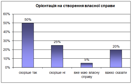 2. Орієнтація на зайнятість у підприємницькій діяльності 2.1 Бажання (небажання) займатись підприємництвом Встановлено наступні факти: • Половина опитаних бажає започаткувати власну справу. Цю частину ймовірно можна охарактеризувати як соціально активну і орієнтовану на реалізацію себе як підприємця; • 5% опитаних відмітили, що мають власну справу; • Не націлені на створення власного бізнесу 25%; • Не стомлювали конкретної думки з цього приводу 20%. Результати подано на діаграмі 2.1.