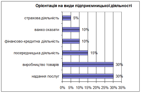 2.2 Орієнтація на види підприємницької діяльності За видами підприємницької діяльності, в яких опитані хотіли б заснувати свою справу, лідирують два види з найбільш високим рівнем прибутковості на даний момент: ٭ надання різного роду послуг (30%); ٭ виробництво та реалізація товарів (30%); Фінансово-кредитна діяльність в зв’язку з великими інвестиційними затратами на початковому етапі розвитку, високим рівнем інфляції та ризику закономірно є мало привабливою ля підприємницької діяльності (10%). Посередницька діяльність в зв’язку з насиченістю ринкових ніш також не користується особливим успіхом в респондентів (15%). Страхова діяльність взагалі виявилась найменш привабливою (5%). Це ймовірно пов’язано із тим, що вона як така є порівняно молодою в нашій країні. 10% - не визначились з вибором сфери підприємницької діяльності. Результати зображені на діаграмі 2.2.