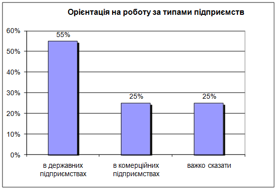 2.5 Установка на роботу за наймом у бізнесі респондент найм бізнес роботодавець В даному дослідженні респондентам було поставлене питання: „Якби Ви мали вибір, де б Ви воліли працювати?”. Результати відображаються на діаграмі 2.5. 25% не визначились. Більшість (55%) хотіли б працювати в приватних комерційних підприємствах, що можна пояснити сподіваннями на більшу матеріальну винагороду, розчаруванням у нестабільності економічної ситуації в державі тощо. Однак досить великий відсоток (25%) студентів прагне працювати на державні підприємства, що ймовірно обумовлене більшим рівнем соціального захисту.