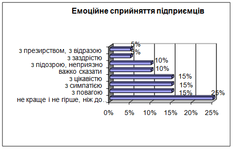 3. Образ підприємця у суспільній думці опитуваних 3.1 Емоційне ставлення В значної частини респондентів (45%) переважають позитивні емоції по відношенню до підприємців; негативні емоції викликають підприємці у 20% опитаних. Окремо слід відмітити, що чверть респондентів (25 %) н виокремлюють для себе підприємців як окрему соціальну групу для оцінювання. Вони до підприємців ставляться не краще та не гірше ніж до решти. (див. діаграму 3.1)