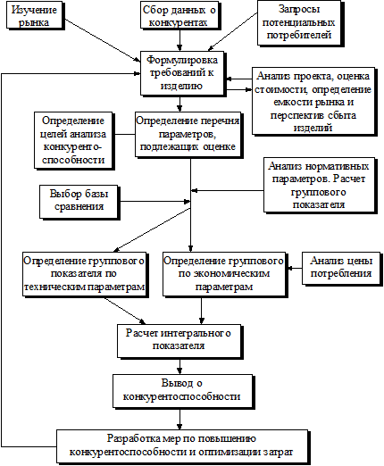 Рис 2 – Схема обеспечения конкурентоспособности Независимо от целей исследования, основой оценки конкурентоспособности является изучение рыночных условий, которое должно проводиться постоянно, как до начала разработки новой продукции, так и в ходе ее реализации. Задача стоит в выделении той группы факторов, которые влияют на формирование спроса в определенном секторе рынка: · рассматриваются изменения в требованиях постоянных заказчиков продукции; · анализируются направления развития аналогичных разработок; · рассматриваются сферы возможного использования продукции; · анализируется круг постоянных покупателей. Вышеизложенное подразумевает “комплексное исследование рынка”. Особое место в изучении рынка занимает долгосрочное прогнозирование его развития, связанное с длительностью осуществления разработки и производства многих видов компьютерной техники. 3. На основе изучения рынка и требований покупателей выбирается продукция, по которой будет проводиться анализ или формулируются требования к будущему изделию, а далее определяется номенклатура параметров, участвующих в оценке. При анализе должны использоваться те же критерии, которыми оперирует потребитель, выбирая товар. 4. По каждой из групп параметров проводится сравнение, показывающее насколько эти параметры близки к соответствующему параметру потребности. 5. Анализ конкурентоспособности начинается с оценки нормативных параметров. Если хотя бы один из них не соответствует уровню, который предписан действующими нормами и стандартами, то дальнейшая оценка конкурентоспособности продукции нецелесообразна, независимо от результата сравнения по другим параметрам. В то же время, превышение норм и стандартов и законодательства не может рассматриваться как преимущество продукции, поскольку с точки зрения потребителя оно часто является бесполезным и потребительской стоимости не увеличивает. Исключения могут составить случаи, когда покупатель заинтересован в некотором превышении действующих норм и стандартов в расчете на ужесточение их в будущем. 6. Производится подсчет групповых показателей, которые в количественной форме выражают различие между анализируемой продукцией и потребностью по данной группе параметров и позволяет судить о степени удовлетворения потребности по этой группе. 7. Рассчитывается интегральный показатель, который используется для оценки конкурентоспособности анализируемой продукции по всем рассматриваемым группам параметров в целом. 8. Результаты оценки конкурентоспособности используются для выработки вывода о ней, а также - для выбора путей оптимального повышения конкурентоспособности продукции для решения рыночных задач. Однако, факт высокой конкурентоспособности самого изделия является лишь необходимым условием реализации этого изделия на рынке в заданных объемах. Следует также учитывать формы и методы технического обслуживания, наличие рекламы, торгово-политические отношения между странами и т.д. 9. В результате оценки конкурентоспособности продукции могут быть приняты следующие решения: - изменение состава, структуры применяемых материалов, комплектующих изделий или конструкции продукции; - изменение порядка проектирования продукции; - изменение технологии изготовления продукции, методов испытаний, сис