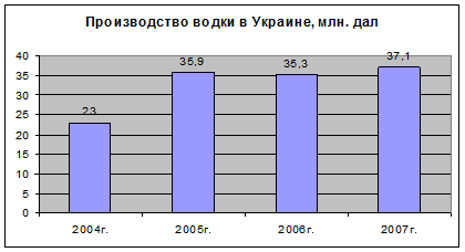 В свою очередь удел небольших предприятий – локальные рынки либо продажа крупному игроку. Так, к примеру, недавно поступил французский производитель алкоголя – компания Belvedere, купив 50% Черкасского ликероводочного завода. Это первый пример приобретения европейским производителем украинского ЛВЗ. Компания планирует покупать и другие активы в алкогольной отрасли, а также выкупать в Украине водку, вино, бренды в среднецелевом и премиальном сегментах. Вместе с тем эксперты рынка утверждают, что в настоящее время в Украине не осталось не так уж много небольших производителей алкогольной продукции, которые могут заинтересовать потенциальных покупателей. Впрочем, среди «последних из могикан» можно отметить такие предприятия, как Ивано-Франковский ликероводочный завод (ТМ «Франківська», «Цісарька»), Львовский ликероводочный завод (ТМ «Вожак», «Володар», «Гетьман», «Первак» и др.) Житомирский ликероводочный завод (ТМ «Житомирская на бруньках»). В 2008 году главной тенденцией на рынке алкогольных напитков остается доминирование пива в потребительской корзине. Украина переходит из разряда стран, ориентированных на крепкий алкоголь, в разряд пивных стран. К тому же на рынке происходит постепенное снижение рентабельности алкогольного бизнеса. Аналитики прогнозируют на 2008 год продолжение роста потребности пива и снижения популярности водки. Участники рынка отмечают и рост потребности коньяков. За останнінесколько лет показатель потребления этого алкогольного напитка в Украине увеличился в два раза. Однако, как прогнозируют аналитики ситуация в ближайшее время будет меняться. Разница в цене между водкой и коньяком будет увеличиваться. Темпы роста самого коньячного рынка будут сокращаться. Но расти он еще будет пять-семь лет, а рынок водки уже не будет расти. Диаграмма 3.2 – Крупнейшие производители водки в Украине