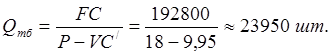 Продажи = табл. 6 доходы от продажи Себестоимость реализованной продукции = табл.11, итого Валовая прибыль = Продажи - Себестоимость реализованной продукции Расходы на сбыт и Административные расходы = табл.12 Операционная прибыль = Валовая прибыль - Расходы на сбыт - Административные расходы Таким образом, предприятие функционирует эффективно, т.к. операционная прибыль составляет 144938,1174 грн. 1) Рассчитаем безубыточный объем производства: 1. Постоянные затраты (FC) = 91600+41200+60000 = 192 800 грн 2. Переменные затраты (VC) =387548,4+121080+18096+10530=537 254,4 грн. 3. Общие затраты (ТС) = 192 800+537 254,4=246 525,4 грн 4. Переменные на единицу = 537 254,4/54 000 =9,95 грн 5. Цена = 18 грн. 6. Безубыточный объем производства