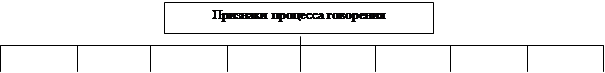 Рисунок 1.1 – Фазы горизонтальной структуры говорения Говорение как речевая деятельность имеет свои специфические признаки: · Говорение всегда мотивированно. Человек говорит, как правило, потому что у него есть какая-то внутренняя причина, есть мотив, выступающий, по выражению А.Н. Леонтьева, в роли мотора деятельности. В методике обучения иноязычному общению следует говорить о коммуникативной мотивации (ведь мотивы присущи и любой другой деятельности). · Говорение всегда целенаправленно, так как высказывание преследует какую-либо цель. · Говорение – это всегда активный процесс, в нем проявляется отношение говорящих к окружающей действительности. Именно активность обеспечивает инициативное речевое поведение собеседника, что так важно для достижения цели общения. · Говорение “обслуживает” все другие виды человеческой деятельности. Процесс речевой деятельности тесно связан с деятельностью мыслительной. Речевую деятельность часто называют “речемыслительной” или “мыслительно-речевой”. Следовательно, любая коммуникативная (речевая) задача является по сути дела речемыслительной задачей. · Говорение неразрывно связано с личностью. Будучи включенной в общественные отношения, личность проявляет активность в своей жизненной позиции, которую она выражает в речи. · Невозможно всякий раз в новой неожиданной ситуации говорить заученными фразами, собственно говорение как деятельность не может быть алгоритмизировано, программа говорения создается самим автором. Поэтому важнейшими особенностями говорения являются его эвристичность и самостоятельность. · Говорение всегда характеризуется определенным темпом,который должен быть не ниже и не выше допустимым в общении норм. · Ситуативность говорения как деятельности проявляется в соотнесенности речевых единиц с основными компонентами процесса общения. Все выше перечисленные признаки способствуют достижению функциональной грамотности во владении языком, т.е. реальное владение им, действительно обеспечивающее учащимся возможность речевого взаимодействия не только не только друг с другом, но и с носителями иностранного языка. Схематично признаки процесса говорения можно представить на рисунке 1.2.