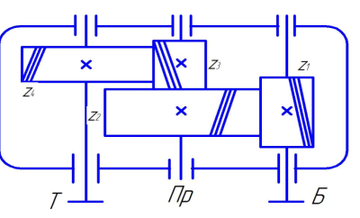 Рис. 1 Кинематическая схема двухступенчатого редуктора. III. Порядок выполнения работы 1. Выполнить эскиз редуктора, замерить габаритные и присоединительные размеры редуктора и проставить их на эскизе (рис.2.) 2. Изучить конструкцию и назначение деталей и составить кинематическую схему редуктора (рис. 1.) 3. Замерить межосевые расстояния aw Б и aw Т . 4. Расшифровать параметры зубчатых передач, заполняя таблицу 1. 5. Для обеих ступеней редуктора вычислить передаточные числа: