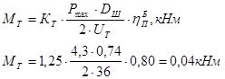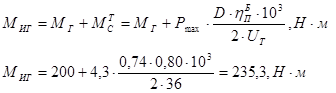 МК = 2250Н∙м (при ПВ = 40%) Прямой КПД : - η = 0,6 (пусковой) – 200 об/мин - η = 0,62 (малой скорости) – 280 об/мин - η = 0,71 (номинальные обороты) – nН об/мин Обратный КПД : - η = 0,45 (пусковой) – 200 об/мин - η = 0,47 (малой скорости) – 280 об/мин - η = 0,69 (номинальные обороты) – nН об/мин Фактическое значение