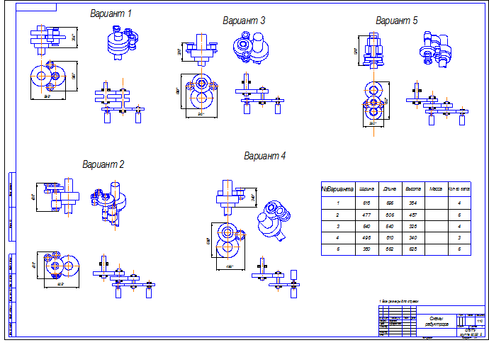 При выборе кинематической схемы были проанализированы несколько схем: Схема 1:Схема трехвального редуктора с шевронной передачей. Преимуществом данной схемы является отсутствие осевой нагрузки на промежуточном вале, и меньшая осевая сила на выходном. Недостатком является сложность конструкции, дороговизна, сложность обеспечения самоустановки плавающего вала, а так же не целесообразность уменьшения осевой нагрузки на выходном валу, т.к. осевая сила от веса колонны значительно превышает осевые силы от зацепления. Схема 2. Схема четырехвального редуктора. Преимуществом данной схемы является наличие двух промежуточных валов что позволяет избежать шестеренок большого и слишком малого диаметра. Преимуществом является возможность подбора различных модулей шестеренок, и позволяет избежать варианта с наименьшим допустимым числом зубьев. Недостатками данной схемы является наличие дополнительного вала, подшипников, что повышает стоимость редуктора. Схема 3.Схема трехвального редуктора. Преимуществом данной схемы является простота конструкции, малые габариты, удобство компоновки, малые осевые размеры валов. Недостатком данной схемы является наличие двух шестеренок с минимальным допустимым количеством зубьев, необходимость использования больших модулей на промежуточном и входном валах. Вариант 4 Схема трехвального редуктора. Преимуществом данной схемы является наличие одного вала для двух гидромоторов, что позволяет сократить количество подшипников Недостатком данной схемы является входной вал. Так как момент, передаваемый им будет в два раза больше чем в остальных схемах, то размеры и стоимость вала существенно возрастут. Недостатком является и расположение одного из моторов над редуктором. Вариант 5 Схема четырехвального редуктора. Отличием данной схемы от схемы варианта 2 является компоновка валов. Данная схема имеет меньшие габариты но для сборки редуктора необходимо две крышки для подшипников, что понижает точность сборки. Выбираем схему 3. 3.2.1 Энерго-кинематический расчет