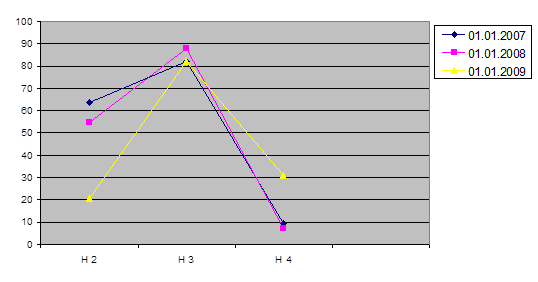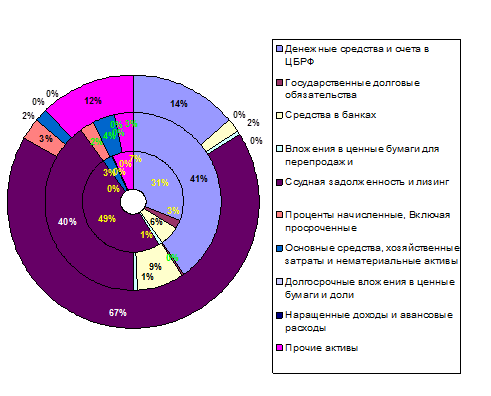 Данные таблицы 5 свидетельствуют о том, что основным видом привлеченных средств ОАО Банка "ВТБ24" являются остатки на расчетных и текущих счетах клиентов, которые соответственно составили на 01/01/2007 - 35895 тысяч рублей, на 01/01/2008 - 80998 тысяч рублей, на 01/01/2009 - 114425 тысяч рублей, их доля соответственно составляла 46%, 36% и 28% в общей сумме привлеченных средств. Следующей важной статьей привлечения денежных средств для банка являются эмитированные им векселя, их доля составила на 01/01/2007 - 19,7%, на 01/01/2008 - 19,5%, на 01/01/2009 - 20,09% от общего объема привлеченных средств. Инициатором сделок с векселями является сам банк. Из этого вытекает, что он не может рассчитывать на привлечение этих ресурсов в обозримом будущем в том же объеме. Банк не уверен, что будет всегда размещать свои векселя. Способность привлекать средства на основе предложения, например векселей, может натолкнуться на неликвидность рынка векселей, снижение их доходности, изменение приоритетов инвесторов. Но основании вышесказанного представляется, что доля таких инструментов привлечения денежных средств, как векселя, должна занимать незначительный удельный вес, в противном случае банк будет подвержен риску ликвидности и процентному риску. Структура использования средств банка представлена в таблице 6. Таблица 6 - Структура активов ОАО Банка "ВТБ24" за 2007-2009 год