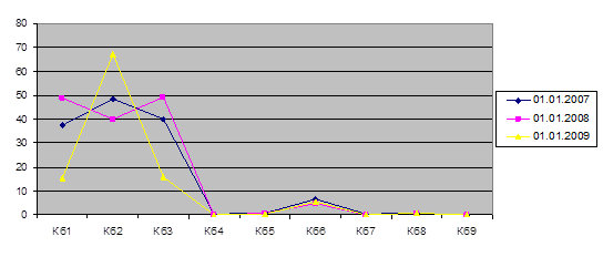 Рисунок 2 Динамика изменения структуры активов ОАО Банка "ВТБ24" за 2007-2009 год Результаты структурного анализа относятся к наиболее наглядным и информативным. Рассмотрим динамику наиболее весомых статей в активе баланса ОАО Банка "ВТБ24": это денежные средства и счета в ЦБ РФ, ссудная задолженность. Денежные средства и счета в ЦБ РФ составили: в 2006 г. - 30572 тысяч рублей, 2007г. - 107934 тысяч рублей, 2008 г. - 67726 тысяч рублей, а удельные веса данной группы в общем объеме активов соответственно составили: 31%, 40%, 14%. Можно отметить, что данная группа активов занимала большой удельный вес в общей сумме активов в 2006-2007г., однако, в 2008г. произошло резкое снижение остатков данных статей в балансе банка, в связи с чем это произошло и как отразилось на ликвидности банка. Следует дать ответ на этот вопрос: данный вид активов не приносит доход банку, практически без риска, высоколиквиден. Наличие остатков в кассе банка, банкоматах, обменных пунктах позволяет производить выплаты в соответствии с требованиями его клиентов. Однако, чем больше остатки средств в кассе, тем выше ликвидность, но тем выше затраты банка. Касса и приравненные к ней средства приносят доход банку в виде комиссий за обналичивание чеков, доставки денежных средств на предприятия и т.д. Однако, эти доходы не сопоставимы с расходами на содержание кассы, технику для пересчета денег, кассовые кабины, перевозку денег, кассовые кабины, содержание сотрудников, охраны и т.д. Остатки средств на корреспондентском счете в Центральном банке обеспечивают ликвидность банку, не приносят доход, но связаны с определенным риском. В частности, списания или зачисления не принадлежащих банку средств, блокирование счета. Такое резкое снижение удельного веса данной статьи в балансе банка настораживает, говорит о том, что банк перешел к весьма агрессивной политике, минимизируя остатки средств в кассе и на счетах в ЦБ, банк стремиться вложить их в более рискованные и высокодоходные операции, например, в кредиты. Данная статья имеет большой удельный вес балансе ООО КБ "ВТБ24" и составляет на 01/01/2007г. - 47840 тысяч рублей, на 01/01/2008 г. - 107745 тысяч рублей, на 01/01/2009 г. - 330247 тысяч рублей, соответственно 49%,40%,67% в общем объеме активов баланса банка. Однако, известно: уровень ликвидности банка тем ниже, чем выше доля кредитов в структуре активов. Это объясняется прежде всего тем, что кредиты и проценты по ним, как правило, не возвращаются в соответствии с первоначальными условиями кредитных соглашений. В этой связи, чем лучше методика оценки кредитоспособности клиентов коммерческого банка, тем лучше качество кредитного портфеля и выше конкурентные позиции банка и его ликвидность. Одновременно следует заметить, что кредитный портфель относится к наиболее доходной его части. Следовательно, банк идет на снижение ликвидности во имя увеличения доходности своей деятельности. 2.3 Анализ ликвидности баланса ОАО Банка "ВТБ24"Оценка ликвидности осуществляется на основе расчета трех групп коэффициентов, подлежащих, в процессе управления ликвидностью, систематическому контролю и регулированию: - коэффициенты структурной ликвидности (К стр.); - коэффициент краткосрочной ликвидности (К кр.); - коэффициенты ликвидности баланса (К б.). Структурные нормативы показывают степень возможного использования пассивов до востребования на более длит