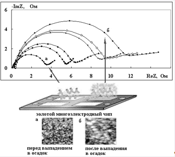 Рисунок 8. Схема компановки биосенсора с нанопреходами по координате электрохимической реакции для регистрации P. aeruginosa АТСС 27853. Взаимодействие антиген-антитело приводит к изменению электростатических характеристик ДЭС, следствием чего является рост тока во внешней цепи электрохимической ячейки. Поскольку большая доля биосенсоров, в состав которых входит трандьюсер, является электрохимическими устройствами, то их работоспособность и воспроизводимость измеряемых данных в значительной мере зависит от материала рабочего электрода, его чистоты. Для массового производства биосенсоров можно использовать Pt о.с.ч. 00 и Au о.с.ч. 00. Нами проведено изучение электрохимического поведения Pt о.с.ч. 00 и Au о.с.ч. 00 в фосфатном буферном растворе (PBS),который использовался в качестве поддерживающего электролита. На рис. 9 показаны ВАХ (вольтамперные характеристики) от межфазной границы раздела Pt/ PBS в зависимости от скорости развертки (V/s) по потенциалу Е. При медленных развертках ЦВАЗ имеет один катодный максимум тока на катодной волне, а сами токи являются токами заряжения. С увеличением скорости развертки величина регистрируемых токов увеличивается, а токи определяются электрической емкостью ДЭС (двойного электрического слоя) межфазной границы. При больших скоростях развертки по потенциалу на ЦВАЗ не наблюдается токовых максимумов, а анодный и катодный ток плавно увеличивается или уменьшается в зависимости от потенциала. Анодная и катодная зависимости ВАХ обусловлены двумя процессами заряжения. Pt после подготовки активная, на что указывают большие анодные и катодные токи электродных процессов, которые реализовываются на ней. Однако форма и характер этих кривых указывает на то, что она находится в состоянии окисления. На рисунке 9 показаны ЦВАЗ при малых скоростях развертки по потенциалу в увеличенном масштабе по сравнению с рисунком 10. При самой медленной скорости развертки по потенциалу в диапазоне от 0.000 до 0.800 В через межфазную границу текут наноамперные токи, указывая на хорошую поляризуемость Pt электрода и на то, что для анодной волны протекают лишь токи заряжения.