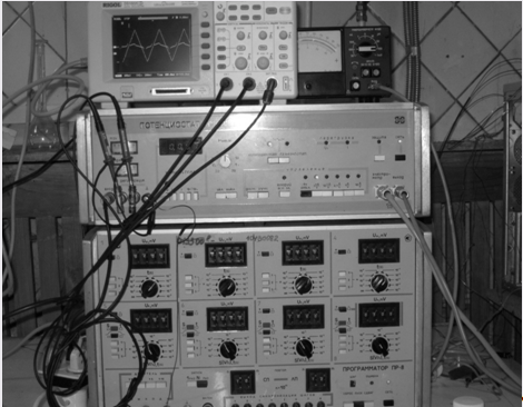 Рисунок 5. Автоматический вычислительно-измерительный компьютеризированный комплекс для исследования электрохимических и биоэлектрохимических межфазных границ. На примере измерений циклических вольтамперных зависимостей для разных межфазных границ, в широком диапазоне потенциалов поляризации и скоростей развертки по потенциалу, проверена работоспособность предложенной установки. Использование осциллографа RigolDC 1022 позволило (рис. 5) перекрыть весь рабочий диапазон параметров потенциостата ПИ 50.1.1. 2.2 Электрохимическая ячейкаДля єксперимента использовалась специально сконструированная фторопластовая электрохимическая ячейка, показанная на рисунке 6. Она отвечает всем требованиям, предъявляемым к измерениям электрохимических вольтамперных, хроноамперных и поляризационных исследований. Ячейка полностью герметична и предназначена для разнообразных нанобиоэлектрохимических исследований в инертной атмосфере аргона или гелия марки о.с.ч.