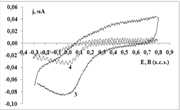 Рисунок 10. ЦВАЗ Pt/ PBS. Рабочий электрод – Pt 00. S = 0.53 см2 . Крутизна 1 мА/V. 3 – V/s = 5·10-2 ; 4 – V/s = 5·10-3 . Параметры потенциостата: