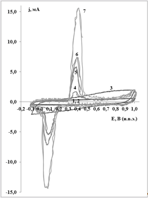 Рисунок19. Pt/ 2НАНОІМАСКМ/ PBS . Рабочий электрод - Pt 00. S = 0.53 см2 . Электрод сравнения хлорсеребряный. Насыщенный KCl. Крутизна 1 мА/V. Скорость развертки V/s = 5·100 . 1 – Pt/ PBS; 2 – Pt/ 2НАНО ІМ АСКМ/ PBS; 3 – + антигены P. aeruginosa АТСС 27853, τ = 5 мин.; 4 – τ = 18 ч.; 5 – τ = 23ч.;6 – τ = 24ч.; 7 – τ = 25 ч. 45 мин. Параметры потенциостата: