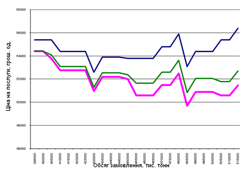 У табл. 3.3 наведено значення функції вибору споживача, тобто залежність вартості задоволення попиту при різних варіантах розподілу замовлень між компаніями А та Б. З рис.3.1 видно, що для споживача найдоцільніше замовити у судноплавної компанії А 430000 одиниць. Але замовлення близько 485000 є також локальним мінімумом. Тому менеджери компанії А мають можливість збалансувати вартість своїх послуг таким чином, щоб точка в 485000 одиниць стала глобальним мінімумом. Таблиця 3.2 Пропозиція судноплавної компанії Б на обраному фрахтовому ринку