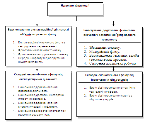 Однією з основних стратегічних цілей судноплавної компанії є підвищення ефективності її діяльності. Підвищення ефективності діяльності судноплавної компанії та торговельного флоту в цілому пов'язане із зростанням продуктивності праці на базі фондозберігаючих напрямів розвитку флоту. Організація прийняття рішень щодо підвищення ефективності діяльності судноплавної компанії ґрунтується на системі основних показників, серед яких можна виділити: обсяг надання послуг, дохід, прибуток, рентабельність, продуктивність ресурсів. Підвищення ефективності діяльності судноплавної компанії повинно відбуватися за такими напрямами: нормалізація провізної спроможності, завдяки чому досягається оптимізація використання основного капіталу та раціоналізація інвестиційних процесів; контроль та скорочення термінів окупності капітальних вкладень; підвищення техніко-економічного рівня судноплавної компанії шляхом уведення в експлуатацію конкурентоспроможних суден (за економічними та функціональними параметрами); підвищення фондовіддачі матеріальних ресурсів; підвищення професійного рівня працівників судноплавної компанії, стимулювання зростання продуктивності праці; посилення контролю ритмічності обслуговування перевізників та термінів доставки вантажів; забезпечення високої якості процесу перевезення. Діяльність судноплавних компаній націлена на ефективну роботу та досягнення найкращих результатів. У цілому, підвищення ефективності діяльності судноплавної компанії ґрунтується на розширенні сфер діяльності та на отриманні додаткових доходів. Крім основної діяльності, із метою підвищення загальної ефективності функціонування, пропонується розширити використання таких видів діяльності, як експлуатація власного флоту судноплавної компанії у закордонних перевезеннях, забезпечення каботажних перевезень зафрахтованими з цією метою суднами; фрахтування власного тоннажу; фрахтування зарубіжного тоннажу для перевезення вантажів як вітчизняних, так і зарубіжних перевізників; передавання флоту під оперування іншим компаніям. Таке вдосконалення експлуатаційної діяльності дозволить збільшити економію валютних коштів від доставки експортно-імпортних вантажів національним флотом, забезпечити додаткові надходження від удосконалення системи управління флотом, забезпечити економію від скорочення втрат під час взаєморозрахунків. Ефективність функціонування системи транспортного обслуговування зовнішньоекономічної діяльності підприємств залежить від ефективності та якості механізму взаємодії між суб'єктами цієї системи. До системи транспортного обслуговування зовнішньоекономічної діяльності підприємств, крім безпосередньо перевізників, зокрема судноплавних компаній, входять експедиторські підприємства та інші сервісні компанія, підприємства технічного обслуговування транспортних засобів та проміжного обслуговування вантажів. Формування ефективного механізму взаємодії суб'єктів і процесів системи транспортного обслуговування зовнішньоекономічної діяльності підприємств передбачає постійний аналіз та контроль результатів діяльності компаній (судноплавних компаній, портів, сервісних та технічних підприємств), пошук шляхів удосконалення функціонування системи та резервів підвищенн