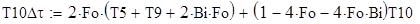 И так из результатов расчёта явным методом следует, что следует работать 73,47 сек, чтобы минимальная температура на противоположной стороне балки (узлы 6 и 10) была равна Tк =122˚С. Расчет распределения температуры по сечению балки неявным методомОсновной недостаток явного численного метода состоит в том, что разностные уравнения баланса энергии для каждого узла должны удовлетворять критерию устойчивости. Чтобы удовлетворять критерию устойчивости в практике приходится выбирать очень маленький шаг по времени, и это приводит к значительному возрастанию объёма расчётов. Рассмотрим другой метод, который является устойчивым при любых значениях чисел Biи Fo. Суть его заключается в том, что уравнение баланса, полученное для явного метода, модифицирует, выражая через температуру в момент времени τ+Δτ. В этом методе разностные уравнения необходимо записывать для всех узлов, поэтому метод получил название неявного. Данный метод в математике называют методом использования левых производных, т.к. производная по времени опраксимируется разностью. Очевидно, что существенное преимущество неявного метода - это отсутствие критериев устойчивости, а недостаток - необходимость решения системы алгебраических уравнений (в отличие от неявного метода в явном можно решать разностные уравнения отдельно для каждого узла). 1. (1+2Fo· (2+Bi)) · (T1 ) τ+ Δτ -2·Fo· (1/2· (T6 ) τ+ Δτ + (T2 ) τ+ Δτ + Bi·T∞ + 1/2·Ts ) - (T1 ) τ =0 2. (1+4Fo) · (T2 ) τ+ Δτ - Fo· ( (T1 ) τ+ Δτ + (T3 ) τ+ Δτ + (T7 ) τ+ Δτ + Ts ) - (T2 ) τ =0 3. (1+4Fo) · (T3 ) τ+ Δτ - Fo· ( (T2 ) τ+ Δτ + (T4 ) τ+ Δτ + (T8 ) τ+ Δτ + Ts ) - (T3 ) τ =0 4. (1+4Fo) · (T4 ) τ+ Δτ - Fo· ( (T3 ) τ+ Δτ + (T5 ) τ+ Δτ + (T9 ) τ+ Δτ + Ts ) - (T4 ) τ =0 5. (1+2Fo· (2+Bi)) · (T5 ) τ+ Δτ -2·Fo· (1/2· (T10 ) τ+ Δτ + (T4 ) τ+ Δτ + Bi·T∞ + 1/2·Ts ) - (T5 ) τ =0 6. (1+4Fo· (1+Bi)) · (T6 ) τ+ Δτ - 4·Fo· (1/2· (T1 ) τ+ Δτ + 1/2· (T7 ) τ+ Δτ + Bi·T∞ ) - (T6 ) τ =0 7. (1+2Fo· (2+Bi)) · (T7 ) τ+ Δτ -2·Fo· (1/2· (T6 ) τ+ Δτ +1/2· (T8 ) τ+ Δτ +Bi·T∞ + (T2 ) τ+ Δτ ) - (T7 ) τ =0 8. (1+2Fo· (2+Bi)) · (T8 ) τ+ Δτ -2·Fo· (1/2· (T7 ) τ+ Δτ +1/2· (T9 ) τ+ Δτ +Bi·T∞ + (T3 ) τ+ Δτ ) - (T8 ) τ =0 9. (1+2Fo· (2+Bi)) · (T9 ) τ+ Δτ -2·Fo· (1/2· (T8 ) τ+ Δτ +1/2· (T10 ) τ+ Δτ +Bi·T∞ + (T4 ) τ+ Δτ ) - (T9 ) τ =0 10. (1+4Fo· (1+Bi)) · (T10 ) τ+ Δτ - 4·Fo· (1/2· (T5 ) τ+ Δτ + 1/2· (T9 ) τ+ Δτ + Bi·T∞ ) - (T10 ) τ =0 1.95-0.460.000.000.00-0.230.000.000.000.00 120,21 0.231.92-0.230.000.000.00-0.230.000.000.00 119,6 0.00-0.231.92-0.230.000.000.00-0.230.000.00 119,6 0.000.00-0.231.92-0.230.000.000.00-0.230.00 119,6 0.000.000.00-0.461.950.000.000.000.00-0.23 120,21 0.460.000.000.000.001.98-0.460.000.000.00 1,23 0.00-0.460.000.000.00-0.231.95-0.230.000.00 0,61 0.000.00-0.460.000.000.00-0.231.95-0.230.00 0,61 0.000.000.00-0.460.000.000.00-0.231.95-0.23 0,61 0.000.000.000.00-0.460.000.000.00-0.461.98 1,23 шаг по пространству - 0.05 шаг по времени - 30.00 начальная температура - 54.0 Распределение температуры по сечению балки