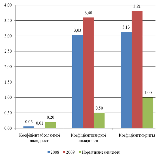 Аналіз ліквідності свідчить, що станом на 31.12.2009р. значення коефіцієнта покриття складає 3,806, що перевищує нормативні значення (1,00 - 2,00) та свідчить про високий ступінь ліквідності підприємства. Тобто на кінець 2009 р. 3,81 гривні оборотних коштів приходиться на кожну гривню поточних зобов’язань. А отже підприємство спроможне своєчасно розрахуватися по зобов’язанням своїми ліквідними активами.