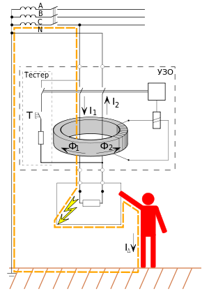 Рис. 4 - Защитные средства: а - диэлектрические перчатки; б - диэлектрические боты и галоши; в - диэлектрический резиновый коврик или дорожка; г - изолирующая подставка К защитным средствам относятся такие, изоляция которых надежно выдерживает рабочее напряжение электроустановок до 500 В и при помощи которых можно касаться токоведущих частей, находящихся под напряжением. Защитные средства должны иметь свой номер, своевременно проходить проверки и испытания, выдаваться для пользования под расписку и применяться в строгом соответствии с их назначением. 9. Защитное отключениеДвухполюсное УЗО с номинальным током 100 А. Устройство защитного отключения (сокр. УЗО ; более точное название: устройство защитного отключения, управляемое дифференциальным (остаточным) током , сокр. УЗО−Д ) - механический коммутационный аппарат или совокупность элементов, которые при достижении (превышении) дифференциальным током заданного значения при определённых условиях эксплуатации должны вызвать размыкание контактов. Может состоять из различных отдельных элементов, предназначенных для обнаружения, измерения (сравнения с заданной величиной) дифференциального тока и замыкания и размыкания электрической цепи (разъединителя). Основная задача УЗО - защита человека от поражения электрическим током и от возникновения пожара, вызванного утечкой тока через изношенную изоляцию проводов и некачественные соединения. Широкое применение также получили комбинированные устройства, совмещающие в себе УЗО и устройство защиты от сверхтока, такие устройства называются УЗО−Д со встроенной защитой от сверхтоков, либо просто диффавтомат . Часто диффавтоматы снабжаются специальной индикацией, позволяющей определить, по какой причине произошло срабатывание (от сверхтока или от дифференциального тока). НазначениеУЗО предназначены для · Защиты человека от поражения электрическим током при косвенном прикосновении (прикосновение человека к открытым проводящим нетоковедущим частям электроустановки, оказавшимся под напряжением в случае повреждения изоляции), а также при непосредственном прикосновении (прикосновение человека к токоведущим частям электроустановки, находящимся под напряжением). Данную функцию обеспечивают УЗО соответствующей чувствительности (ток отсечки не более 30 мА). · Предотвращения возгораний при возникновении токов утечки на корпус или на землю. Цели и принцип работы |