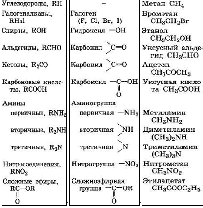 Рис. 3 Огромное число органических соединений требует их четкой классификации. Основу органического соединения составляет скелет молекулы. Скелет может иметь открытую (незамкнутую) структуру, тогда соединение называют ациклическим (алифатическим; алифатические соединения называют также соединениями жирного ряда, т.к. они впервые были выделены из жиров), и замкнутую структуру, тогда его называют циклическим. Скелет может быть углеродным (состоять только из атомов углерода) либо содержать другие, отличные от углерода атомы - т. наз. гетероатомы, чаще всего кислород, азот и серу. Циклические соединения подразделяют на карбоцикличе-ские (углеродные), которые могут быть ароматическими и алициклическими (содержащими один или несколько циклов), и гетероциклические. Атомы водорода и галогенов в скелет не входят, а гетероатомы входят в скелет лишь в том случае, если они имеют, по меньшей мере, две связи с углеродом. Так, в этиловом спирте СН3СН2ОН атом кислорода не включён в скелет молекулы, а в диметиловом эфире СН3ОСН3 включён в него. Кроме того, ациклический скелет может быть неразветвлённым (все атомы расположены в один ряд) и разветвлённым. Иногда неразветвлённый скелет называют линейным, однако следует помнить, что структурные формулы, которыми мы чаще всего пользуемся, передают лишь порядок связи, а не реальное расположение атомов. Так, «линейная» углеродная цепь имеет зигзагообразную форму и может закручиваться в пространстве различными способами. В скелете молекулы различают четыре типа атомов углерода. Принято атом углерода называть первичным, если он образует только одну связь с другим атомом углерода. Вторичный атом связан с двумя другими атомами углерода, третичный - с тремя, а четвертичный все свои четыре связи затрачивает на образование связей с атомами углерода. Следующим классификационным признаком является наличие кратных связей. Органические соединения, содержащие только простые связи, называются насыщенными (предельными). Соединения, содержащие двойные или тройные связи, называются ненасыщенными (непредельными). В их молекулах на один атом углерода приходится меньшее число атомов водорода, чем в предельных. Циклические ненасыщенные углеводороды ряда бензола выделяют в отдельный класс ароматических соединений. Третьим классификационным признаком является наличие функциональных групп-групп атомов, характерных для данного класса соединений и определяющих его химические свойства. По количеству функциональных групп органические соединения делятся на монофункциональные - содержат одну функциональную группу, полифункциональные - содержат несколько функциональных групп, например глицерин, и гетерофунк-циональные - в одной молекуле несколько различных групп, например аминокислоты. В зависимости от того, у какого атома углерода находится функциональная группа, соединения делятся на первичные, например этилхлорид СН3 СН2 С1, вторичные - изопропилхлорид (СНз)2СНС1 и третичные - бутилхлорид (СН8 )8 ССl. Функциональная группа определяет принадлежность органического соединения к тому или иному классу (см. таблицу). Органические соединения обладают самыми разнообразными свойствами. Как непохожи природный газ, сахар и, например, полиэтилен! Тем не менее, органические соединения имеют свои специфические особенно