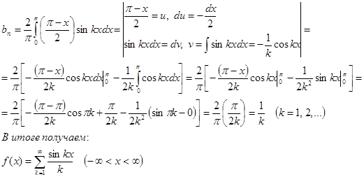 О разложении в ряд Фурье непериодической функции. Пусть на некотором отрезке Рассмотрим, далее, следующий важный случай. Пусть функция f(x) задана на отрезке [0,l]. Дополняя определение этой функции произвольным образом на отрезке [-l,0] (сохраняя кусочно монотонность), мы можем разложить эту функцию в ряд Фурье. В частности, если мы продолжим определение функции f(x) при Решение: При разложении ряд Фурье по синусам функцию на интервале [0;2] продолжаем нечётным образом. Доопределим функцию четным образом (симметрично относительно oy). Найдем коэффициенты Фурье: а0 = аn =0 bn =