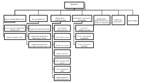 Рисунок 1. Существующая штатная структура. Подобная организационная структура является функционально-ориентированной. Каждое подразделение выполняет определенные функции. Основные бизнес-процессы компании проходят через все функциональные блоки, которые связаны друг с другом только через руководство компании. При таком подходе большинство вопросов приходится решать не на горизонтальном уровне, а подниматься на несколько уровней управления. При наличии функциональной организационной структуры сотрудник ориентирован на выполнение задач собственного подразделения, и часто это никак не соотносится с результатами деятельности компании в целом. При функциональной ориентации планы и задания, которые доводятся до каждого подразделения, могут выполняться и даже перевыполняться, но результаты деятельности компании оказываются ниже плановых, и деятельность компании остается неэффективной. 1.3 Основные проблемы управления В рассматриваемой организации существует ряд нижеперечисленных проблем управления. Отсутствие чётко сформулированной стратегии. Направления развития выбираются скорее исходя из текущих запросов рынка. Отсутствует видение ситуации на несколько шагов вперёд. Организация построена по функциональному признаку. Часто нет понимания кто отвечает за проект в целом, по причине чего происходят нестыковки в местах соприкосновения функциональных подразделений Нет чётко распределённых сфер ответственности между руководителями подразделений. Часто одно подразделение выполняет работу другого, тем самым неэффективно используя ресурсы. Наличие 2-х направлений разработки программных продуктов, часто имеющих схожий функционал. Отсутствие общей концепции, что приводит к дублированию, а часто и несовместимости собственных разработок. Также налицо неэффективное использование ресурсов. Это влечёт за собой дополнительный штат внедренческого персонала. Отсутствие планирования. Часто приводит к авральному выполнению проектов и нехватке сотрудников. Слаборазвитая система отчётов и документирования проектов. Это влечёт за собой недостаточную информированность, а иногда даже частичную незаменимость сотрудника, участвовавшего в конкретном проекте Отсутствие чётко сформулированных должностных обязанностей сотрудников. Нет формализованного описания действий и требований по выполнению конкретных работ. Информация часто передается из уст в уста, нет установленной программы обучения новых сотрудников. 1.4 Постановка стратегических целей В данный момент миссия и стратегия компании не сформулированы, поэтому попытаюсь их формулировать на основе собственного понимания и когда-то услышанных мыслей руководителя. МиссияПредоставлять высококачественные решения и сервис в сфере автоматизация деятельности организаций и предприятий любого масштаба. Всегда соответствовать последним тенденциям в области разработки информационных решений. Стать синонимом понятий качество, функциональность, прогресс на рынке ИТ. Стратегический профильТекущую стратегию я бы сформулировал следующим образом: Расширение влияния на рынке информационных систем для различных секторов рынка, в первую очередь в сегменте федеральных органов власти, выпуск качественных и современных продуктов, удовлетворяющих потребности зака