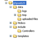 Рис. 2 Структура каталогов веб-приложения Рассмотрим подробнее назначение каждого каталога: · Htdocs – корневой каталог, к которому будет обращаться веб-сервер. Именно этот каталог указывается в конфигурационной информации Apache и именно к нему обращается сервер, когда пользователь запрашивает страницу на веб-сайте. · Data – каталог для хранения данных. Он будет содержать журналы регистрации событий, закачанные пользователями на сайт файлы и различные временные данные. Данный каталог будет содержать несколько подкаталогов для отдельных типов данных: logs , uploaded - files , tmp . · Include – каталог классов PHP. В нем будут храниться все функции и библиотеки PHP. Кроме собственного кода, здесь же будут размещаться и все готовые сценарии, заимствованные у других разработчиков. Контроллеры приложения (сценарии, которые определяют операции, разрешенные пользователю на веб-сайте) будут располагаться в подкаталоге Controllers . После того как мы создадим виртуальный сервер Apache для приложения, каталог Include будет включен в директиву PHPinclude _ path . · Temlates – каталог шаблонов, в нем будут храниться шаблоны веб-сайта. Настройка виртуального сервера