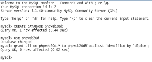 Рис. 3 Конфигурация веб-сервера Apache Виртуальный сервер - сервер, который используются для присвоения одному компьютеру нескольких доменных имен. Чтобы успешно сконфигурировать веб-сервер, необходимо вначале создать запись <VirtualHost> для Apache. Для этого нужно в директории G:\usr\local\apache\conf отредактировать уже имеющийся файл httpd.conf. Код для конфигурации web-сервера приведен на рис.3 . Остановимся подробнее на некоторых записях: · VirtualHost 127.0.0.1 – адрес виртуального сервера · ServerName phpweb20 – имясервера «phpweb20» · Directory " G :\ home \ localhost \ www \ phpweb 20\ htdocs " – указывает, в какой директории искать главный файл index . php . Благодаря данной записи появилась возможность обращаться к index . php с помощью адреса http://localhost/. · php _ value include _ path ".; G :\ home \ localhost \ www \ phpweb 20\ include \; G :\ usr \ local \ php 5\ PEAR " – данная запись сообщает модулю PHP, где искать нужные для работы приложения функции на языке PHP. Настройка базы данных Задача данного этапа – создать базу данных MySQL, которая будет использоваться в работе веб-приложения. У MySQL есть собственный интерфейс для организации взаимодействия с клиентами, с помощью которого можно перемещать данные и изменять параметры базы данных. Назначение пользователей базы данных позволяет ограничить круг пользователей, обладающих правом доступа к таблицам на сервере. Каждый сервер MySQL может содержать несколько баз данных, где группируются таблицы. Веб-приложения, работающие на стороне сервера, могут использовать как свои собственные или как единую. Общую для всех приложений базу данных [2]. Чтобы подключиться к базе данных с целью ее использования, нужно знать: · IP-адрес сервера баз данных; · Имя базы данных; · Имя пользователя; · Пароль Один из способов взаимодействия с MySQL основан на использовании клиента командной строки MySQL. Чтобы запустить режим командной строки, нужно найти исполняемый файл. В нашем случае он находится по адресу: G:\usr\local\mysql-5.1\bin . Запустивфайлmysql_run_to_import_dumps.exe, появитсяожиданиекомандывода (mysql> ). Для создания базы данных мы используем последовательность команд, изображенную на рис.4 .