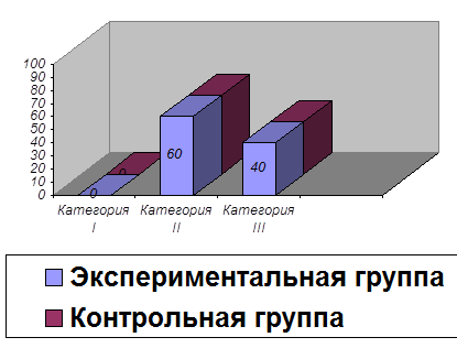 Анализ диаграммы показывает, что в обеих группах – и контрольной, и экспериментальной – дети имеют одинаковые проблемы в общении. После формирующего воздействия показатели изменились и выглядят следующим образом: - в экспериментальной группе 3 детей смогли справиться и устранить основные «помехи» общения – категория I – 60%; у двоих детей наблюдаются некоторые проблемы в общении, но в менее выраженной степени – категория II – 40%; - в контрольной группе выраженных изменений не наблюдается: один ребенок относится к категории I (20%), трое – к категории II (60%), один ребенок – категория III (20%). Выразим это в диаграмме 4. Диаграмма 4 Диагностика «помех» в общении детей с заиканием 8-9 лет (после формирующего воздействия)