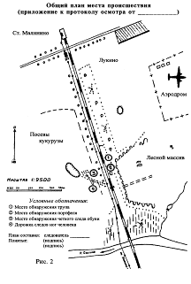 Рисунок 1. – Общий план места происшествия 8 Осмотр места происшествия нуждается в записи на видеограмму, если его обстановка очень сложна, а время для производства ограничено. Особенно большую помощь в быстрой, полной и наглядной фиксации видеозапись оказывает в ходе осмотров мест происшествий, связанных с крушениями, авариями, катастрофами, взрывами, обрушениями зданий и пожарами, когда необходимо принимать меры для скорейшей ликвидации последствий произошедшего, что неразрывно связано с изменением первоначальной обстановки, когда место происшествия вредная или специальная территория (шахта, подводное или подземное сооружение) и т.п. Подготовка к видеофиксации здесь, как правило, сводится к ориентировке на месте, поскольку до прибытия туда ни условия съемки, ни объекты, подлежащие запечатлению, неизвестны. Вначале рекомендуется съемка общим планом для ориентации места происшествия на окружающей местности, лучше всего посредством панорамирования. Затем общий вид самого места путем его обзорной видеосъемки общим и средним планами. Далее необходимо перейти к фиксации действий следователя по осмотру наиболее важных объектов и запечатлению последних с разных точек крупным и детальным планами, фиксируя их криминалистические особенности, а также следы. Звуковым сопровождением будут пояснения следователя, даваемые по ходу осмотра. При осмотре частей расчлененного трупа каждая из них должна быть отмаркирована, сфотографирована, описана с обязательным указанием: 1. анатомического характера, размеров и формы отчлененной части тела с характеристикой всех поверхностей, толщины подкожной жировой клетчатки, степени развития мышц; 2. трупных изменений, в том числе гнилостных; 3. характера загрязнений и положений (земли, волокон ткани, бумаги и других элементов), фауны и флоры; 4. детальной характеристики повреждений, особенно на голове, шее и туловище, где могут быть обнаружены огнестрельные, колото-резаные раны, странгуляционные борозды и др. Особенно тщательно рассматриваются линии расчленения, характер кожи по краям резанных, рубленных, пиленых ран, разрубов (распилов) костей, кровоизлияний. На костях и хрящах с помощью лупы изучаются поверхности разделения с целью выявления трасс, оставленных орудием расчленения. Число ударов иногда удается установить по наличию нескольких несовпадающих плоскостей надрубов (разрубов). Положение конечности при отчленении может быть установлено по направлению и локализации повреждений, следам крови. Ровная поверхность расчлененной кости образуется со стороны удара, с противоположной имеются краевые дефекты, выступы, раздробления; костные фрагменты смещаются в направлении удара. Телесные повреждения костей легко устанавливаются по наличию характерных опилок. На действие дисковой электропилы указывает ровное разделение тканей на донном уровне вне зависимости от разной их плоскости. Посмертное расчленение, как правило, не сопровождается обескровливанием внутренних органов. Вся методика описания трупа должна быть направлена на выяснение возможностей установления личности умершего, его пола, возраста, роста, особых примет, причины и давности смерти, характера расчленения. Однако все эти вопросы решаются только после исследования трупа в морге и дополнительных лабораторных исс