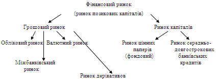 Рис.1. Схема фінансового ринку Як ми бачимо з ріс.1 фондовий ринок є важливою складовою частиною фінансового ринка. Під фондовим ринком розуміють такий розділ фінансового ринку, на якому за незначний час створюються необхідні умови і відбуваються швидка мобілізація, ефективний перерозподіл і раціональне розміщення фінансових ресурсів в соціально-економічному просторі держави з врахуванням інтересів і потреб суспільства шляхом здійснення емісій коштовних паперів різними емітентами.У вузькому ж розумінні, фінансовий ринок, як правило, означає взаємодію, яка відбувається на ринку між його суб'єктами з приводу випущених коштовних паперів. Головною метою фондового ринку кожної країни є становлення цілісного, високоліквідного, ефективного і справедливого ринку, регульованого державою і інтегрованого в світові фондові ринки. Фондовим ринком є сукупність стосунків цивільно-правового характеру, які опосередковують рух капіталів у формі коштовних паперів. Він доповнює в структурі фінансового ринку ринок банківських кредитів і тісно взаємодіє з ним. Особливості фондового ринку такі: - фондовий ринок завжди виступає як ринок ризикових капіталів, де зростання та падіння курсів цінних паперів залежить від багатьох факторів, які слід постійно враховувати у практичній діяльності; - курси цінних паперів, як і їхня емісія залежить від рентабельності та кон’юнктури виробництва, економічного стану, від стану ринку позичкових капіталів і рівня облікової ставки; - із розвитком акціонерного капіталу зростає роль фондових бірж та позабіржового фондового ринку, де суперечності більш гострі, а їхній прояв глибший і сильніший. Позабіржовий фондовий ринок впливає на біржовий ринок і на всю банківську сферу своєю непередбачуваністю; - прибуток акціонерних товариств стає відомим лише після річних звітів, тому іноді курси акцій залежать від очікуваних дивідендів. На підставі цього вони стають об’єктом спекулятивних дій, залежать від випадкових обставин, реклами, боротьби за зростання чи зниження курсів акцій; - падіння курсів цінних паперів може бути таким стрімким та непередбачуваним, що спричиняє катастрофічну паніку. Фондові ринки закриваються, угоди не укладаються, банкрутства досягають найбільшого розмаху. Утримувачі цінних паперів, особливо дрібні інвестори, розорюються. Зиски мають тільки великі інвестори. В цьому процесі фондовий ринок стає інструментом централізації капіталу, а біржові кризи – методом цієї централізації; - кризи призводять до різкого скорочення емісії цінних паперів та падіння попиту на позичковий капітал. В економічній літературі фондовий ринок розглядається як частина ринку позичкових капіталів, де відбувається процес купівлі-продажу цінних паперів: акцій та облігацій, їхня емісія. Розрізняють первісний ринок, де відбувається емісія та первинне розміщення цінних паперів, і вторинний ринок, де відбувається купівля-продаж, котирування, обіг, зміни титулів власності на цінні папери. Як правило, це фондова біржа та позабіржовий ринок, які об’єднує загальне поняття – фондовий ринок. Фондовий ринок має складну структуру, де перехрещуються інтереси багатьох учасників, кожен з певною функціональною особливістю та метою діяльності. До них належать: емітенти – це держава або якась юридична особа, що має 