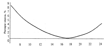 Анализ таблицы показывает, что уже после четвертого дня уборки яровой пшеницы потери достигают 6,7% и в дальнейшем возрастают ежедневно в среднем на 1% и более. Поэтому уборку необходимо начинать в момент образования максимального биологического урожая, после наступления полной спелости зерна и заканчивать в очень сжатые сроки во избежание потерь от самоосыпания зерна и снижения его качества при переросте на корню или нахождении в валках. Однако при резком сокращении сроков уборки хозяйство будет нести убыток из-за дополнительного приобретения техники и затрат на ее эксплуатацию. Величина потерь зерна зависит не только от продолжительности сроков уборки, но и от продолжительности рабочего дня и времени суток (рис.1).