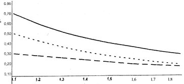 Рис. 3. График изменения потерь свободным зерном за жаткой в зависимости от скорости движения комбайна при различных значения. При испытании комбайнов были проведены опыты для определения влияния соотношения скорости планки мотовила и движения комбайна на потери свободным зерном при различной скорости движения комбайна. Опыты проводились при VK / Vпл =0,55;0,61;0,69 на уборке высокостебельной озимой ржи. Из графика видно, что в данных условиях с уменьшением соотношения скоростей потери свободным зерном снижаются. Это снижение тем значительнее, чем выше скорость комбайна. При скорости равной 1,08 м/с, потери уменьшились с 0,7% (при VK / Vпл =0,69) до 0,3% (при VK / Vпл =0,55) с увеличением скорости комбайна изменение соотношения в указанных пределах менее существенно влияет на потери свободным зерном. Существенное влияние на потери зерна играет засоренность хлебостоя (рис.4).