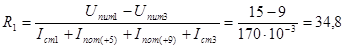 Проектирование блока питания Источник питания должен обеспечить питание частотомера и генератора, а именно: Операционному усилителю К140УД26А с напряжением питания Uпит = ±15 В, мультивибратору К1006ВИ1 с напряжением питания Uпит = +9 В, микросхеме 530ИЕ14 напряжением питания Uпит = +5 В, микросхеме 530ЛА3 с напряжением питания +5 В, микросхеме 133ПП4, индикатору АЛС333Б с напряжением питания +9 В, микросхеме 530ЛЕ1 с напряжением питания Uпит = +5 В, микросхеме 530ЛН1 с напряжением питания Uпит = +5 В, микросхеме 530ТМ2 с напряжением питания Uпит = +5 В. Суммарный потребляемый ток данных микросхем, нагрузки усилителя равен Iпот = Iпот.ген + Iпот.част + Iнагр =8∙10-3 +190∙10-3 +10∙10-3 =0,208 А. Исходя из этого, выбираем трансформатор Т1 ТП–112-9 с током номинальной нагрузки 0,35 А, имеющий 2 вторичные обмотки с номинальным напряжением Uном =17 В. Для выпрямленного напряжение на вторичных обмотках трансформатора используем 2 диодных моста VD1, VD2 серии КЦ419А с Iпр. max =1,5 А. Для стабилизации напряжения будем использовать: для напряжения питания Uпит1 = +15 В – микросхему DA1 K142EH8, для напряжения питания Uпит2 = -15 В – микросхему DA2 K142EH11, для напряжения питания Uпит3 = +9 В – стабилитрон СТ1 KС191С с Iст1 =10 мА, для напряжения питания Uпит4 = +5 В – стабилитрон СТ3 KС156А с Iст3 =10 мА. Определим номиналы сопротивлений R1 , R2 :