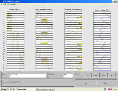 Рис.13. Графический интерфейс редактора правил после задания базы правил для данной системы нечеткого вывода Теперь можно выполнить оценку построенной системы нечеткого вывода для задачи автоматического управления расходом воздуха. Для этого откроем программу просмотра правил системы Matlabи введем значения входных переменных для частного случая, когда упругость дутья равна 1,5, высота кипящего слоя 2,3 и разрежение под сводом 2,8. Процедура нечеткого вывода, выполненная системой Matlabдля разработанной нечеткой модели, выдает в результате значение выходной переменной "расход воздуха", равное 2,56 (рис.14).