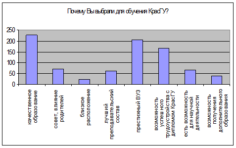Контент-анализ вариантов ответов, предложенных студентами, показал, что КрасГУ это также и «интересный круг общения», «интересные знакомства» - 5 ответов из 17. С помощью второго вопроса: «Почему Вы выбрали для обучения КрасГУ?» можно определить те факторы, которые важны для абитуриентов и которые, соответственно влияют на формирование имиджа КрасГУ. Для ответа на данный вопрос респондентам предлагались следующие варианты ответов: качественное образование; совет, влияние родителей; близкое расположение к дому; лучший преподавательский состав; самый престижный ВУЗ; возможность успешного трудоустройства с дипломом КрасГУ; есть возможность для научной деятельности; возможность получения дополнительного образования. Помимо этих вариантов, респондентам предлагалось указать свой вариант ответа. Как показали результаты анализа (см. рис. №4), студенты при выборе ВУЗа руководствуются тремя основными характеристиками: качественное образование, престиж ВУЗа и возможность успешного трудоустройства с дипломом ВУЗа. Из этих данных можно сделать вывод, что при формировании имиджа для такой целевой аудитории как абитуриенты необходимо в первую очередь позиционировать КрасГУ как самый престижный ВУЗ, дающий все необходимые знания для подготовки высококвалифицированных специалистов, которое ценятся на рынке труда. Рис. №4.