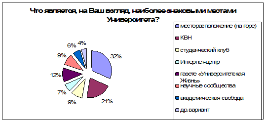 Для определения знаковых мест Красноярского Государственного Университета был задан вопрос номер 3: «Что является, на Ваш взгляд, наиболее знаковыми местами Университета?». Респондентам предлагалось выбрать один или несколько вариантов, также давалась возможность указать свой собственный вариант. Предложенные варианты: «месторасположение (на горе)», «КВН», «студенческий клуб», «Интернет-центр», «газета «Университетская Жизнь», «научные сообщества», «академическая свобода». Анализ ответов респондентов (см. рис.№5-6) показал, что для студентов знаковым местом является месторасположение Университета – отдаленность от города, расположение на возвышенности среди леса (32% респондентов отметили это знаковое место). Еще одним важным элементом является, по мнению респондентов, университетский КВН – 21 % респондентов высказали данное мнение. Газету «Университетская жизнь» выделили из предложенных вариантов ответов 12 % респондентов. Образы знаковых мест (если они есть) необходимо использовать при формировании любого имиджа, в том числе имиджа ВУЗа. Результаты корреляционного анализа показывают взаимосвязь отношения студентов к КВН как к знаковому месту КрасГУ и важности для студентов престижа и репутации (дающие обучение в Университете) (коэффициент корреляции 0.2, 0,19 соответственно). В связи с тем что из стен Красноярского Государственного Университета вышла не одна знаменитая команда КВН («Левый берег», «Запал», «Без тормозов»), возможно, по этой причине проявляется зависимость репутации и престижа от университетского КВН. Следует отметить, что, предлагая свой вариант ответа, 3% студентов сошлись во мнении, о том, что знаковым местом КрасГУ являются корпусы, построенные в виде «колодцев». Рис. №5