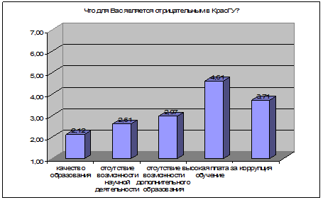 При анализе вариантов ответов, которые предлагали сами респонденты, никакой тенденции не обнаружилось. В основном это были единичные, не повторяющиеся варианты, такие как: «самим выбирать преподавателя», «Улучшить систему питания», «Соответствие между оплатой и условиями обучения», «Повысить стипендию, зарплату преподавателям», «Увеличить парковку около КГУ» и т.п. Следующий вопрос анкеты позволяет выявить отрицательные характеристики КрасГУ в представлении студентов. При ответе на вопрос: «Что для Вас является отрицательным в КрасГУ?», респондентам предлагалось отметить по семи бальной шкале отношение к каждому представленному варианту ответов. Анализ студенческих ответов (см. рис. №11) позволил установить, что наиболее отрицательной характеристикой является высокая плата за обучение. Стоит отметить, что данной позиции придерживаются 200 студентов, хотя всего 117 студентов обучаются на платной основе. Возможно это определенное проявление солидарности студентов. Остальные категории (качество образования, отсутствие возможности научной деятельности, отсутствие возможности дополнительного образования, коррупция) респонденты не выделяют как имеющие сильный отрицательных характер. В ответах, представленных самими респондентами, «единодушия» нет – в основном единичные ответы (например: «Качество питания», «Плохие аудитории, отопление», «Отношение преподавателей к студентам», «Большие группы», «Отсутствие практических занятий», «Отсутствие гардероба», «Отсутствие библиотеки в академ городке»). Интересно, что в предыдущих вопросах респонденты отметили, что качественное образование является самым важным фактором и удовлетворенность этим фактором низка (см.рис.№7), однако, при ответе на этот вопрос, студенты не высказали мнения что качество образования является отрицательным. Возможно причина в том, что, по мнению студента, уровень качества образования необходимо повысить, однако и сейчас качество предоставляемых знаний приемлемое. Рис. № 11.