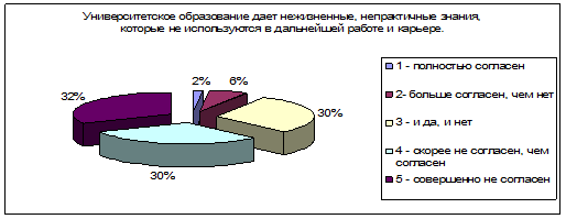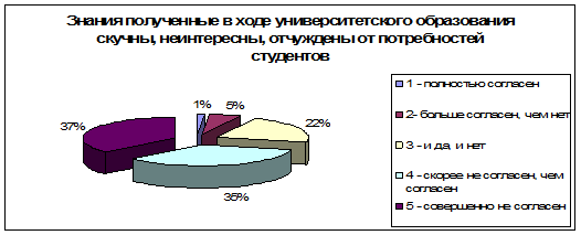 При изучении имиджа КрасГУ необходимо понять какое отношение у целевой аудитории к услуге, которую предоставляет Университет. Для этого были заданы два вопроса, в которых необходимо отметить в какой степени согласен либо не согласен респондент с утверждениями: «Университетское образование дает нежизненные, непрактичные знания, которые не используются в дальнейшей работе и карьере». «Знания полученные в ходе университетского образования скучны, неинтересны, отчуждены от потребностей студентов». Результаты опроса представлены в виде диаграмм на рисунках № 12; № 13. Рис. № 12
