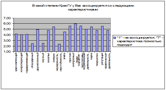 Очень интересным представляется следующий вопрос, в котором спрашивается «В какой степени КрасГУ у Вас ассоциируется со следующими характеристиками: вдохновляющий, контролирующий, поддерживающий, отчужденный, дружественный, скучный, веселье, интерес, неуверенность, неустойчивость, элита, престиж, интересные люди, ощущение перспективы, теоретическая деятельность, наука, творчество, репутация, практическая деятельность». По полученным данным (см. рис. № 15) можно сделать вывод, что в первую очередь Университет ассоциируется в представлении студентов с интересными людьми (среднее значение по семи бальной шкале – «6»). В противовес данным, полученным из предыдущих ответов, где на первое место выходили такие характеристики Университета как престиж и качество образования. Данный вопрос помог открыть еще одну составляющую имиджа КрасГУ – это «интересные люди», которую также необходимо учитывать при формировании имиджа Университета. Можно выделить еще несколько характеристик, которые набрали высокий балл по ассоциациям с Университетом: «Ощущение перспективы», «престиж», «репутация», «интерес», «наука», «теоретическая деятельность». Соответственно эти характеристики являются важными составляющими имиджа КрасГУ. Студенты не ассоциируют КрасГУ с таким показателем как «неуверенность, неустойчивость», наоборот, такая характеристика как «ощущение перспективы» имеет высокий балл, это говорит о том, что Университет дает студенту определенную уверенность в завтрашнем дне. Интересно отметить, что такие характеристики как «контролирующий», «поддерживающий», «вдохновляющий» имеют средний балл, в тоже время КрасГУ не является «отчужденным» для студента. Предполагаю, что эти данные можно объяснить следующим образом: Университет – важная составляющая жизни студента, однако в тоже время он не имеет влияния на студента. Рис. № 15